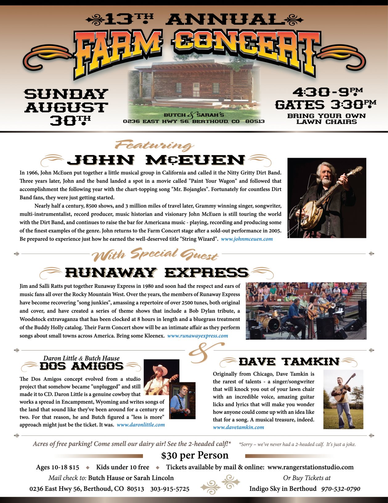 Aug. 20 - Jim, Salli, Butch, Chris, Dan and Dana Vernon joined John McEuen at the 13th Annual Farm Concert in Berthoud. photos poster |